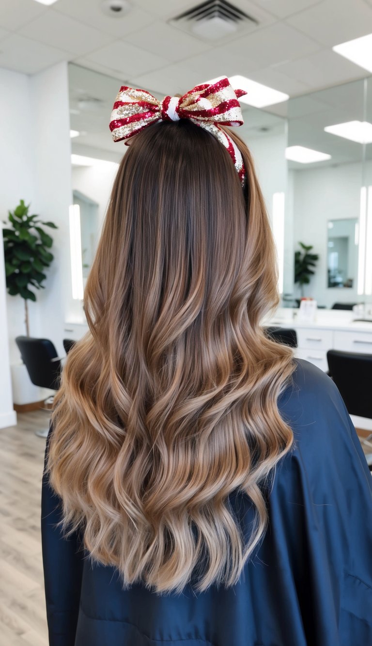 Topping soft, flowing waves, this glittery red-and-white bow has a playful, candy cane-inspired vibe. You’ll look sweet and festive for every Christmas gathering with this look.