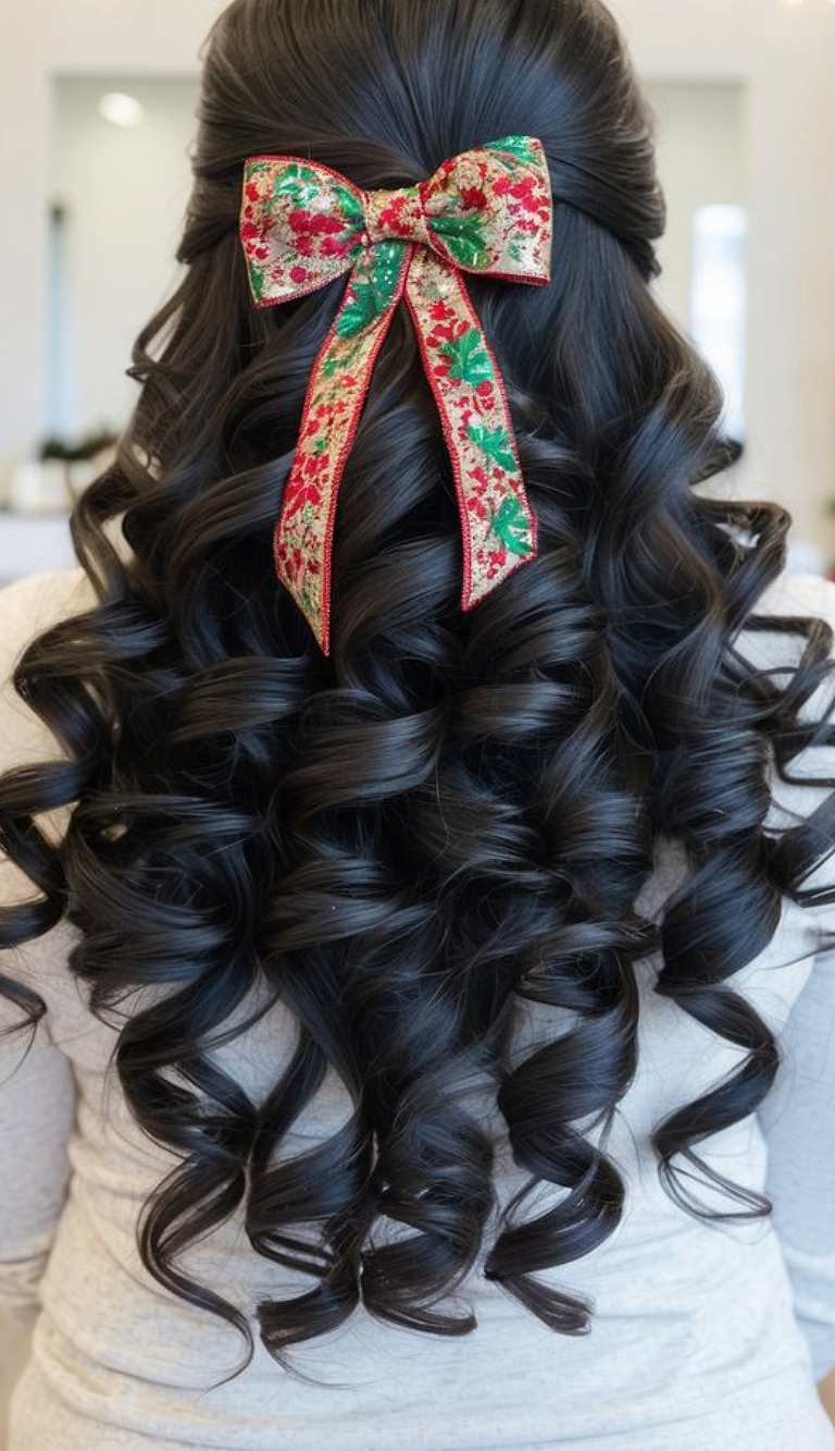 Going with a simple half-up hairstyle? Adorn it with a green bow featuring Christmas motifs to dress it up for the holidays. It brings festive charm to your look and works for both casual and dressy occasions.